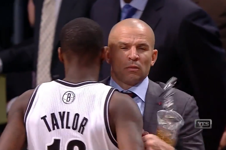 NBA Sullaði Jason Kidd viljandi niður í nótt til að tefja leikinn? Undir lok leiks Nets og Lakers í nótt þá rakst Tyshawn Taylor utan í Jason Kidd með þeim afleiðingum að Kidd sullaði niður drykknum... admin28. nóvember 2013