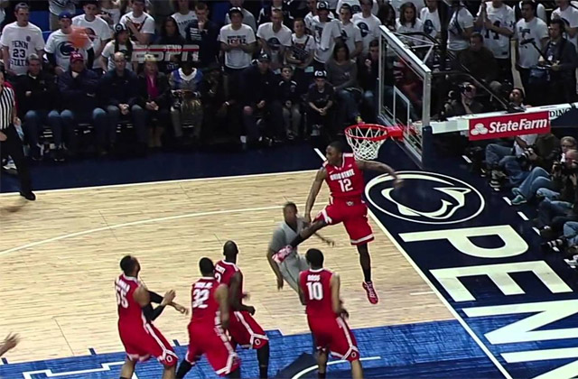 Heimurinn Háskólaleikmaður setur boltann af tveimur leikmönnum og ofan í Ætti þetta að vera skráð sem stoðsending eða karfa hjá Marshall Henderson? admin17. desember 2013