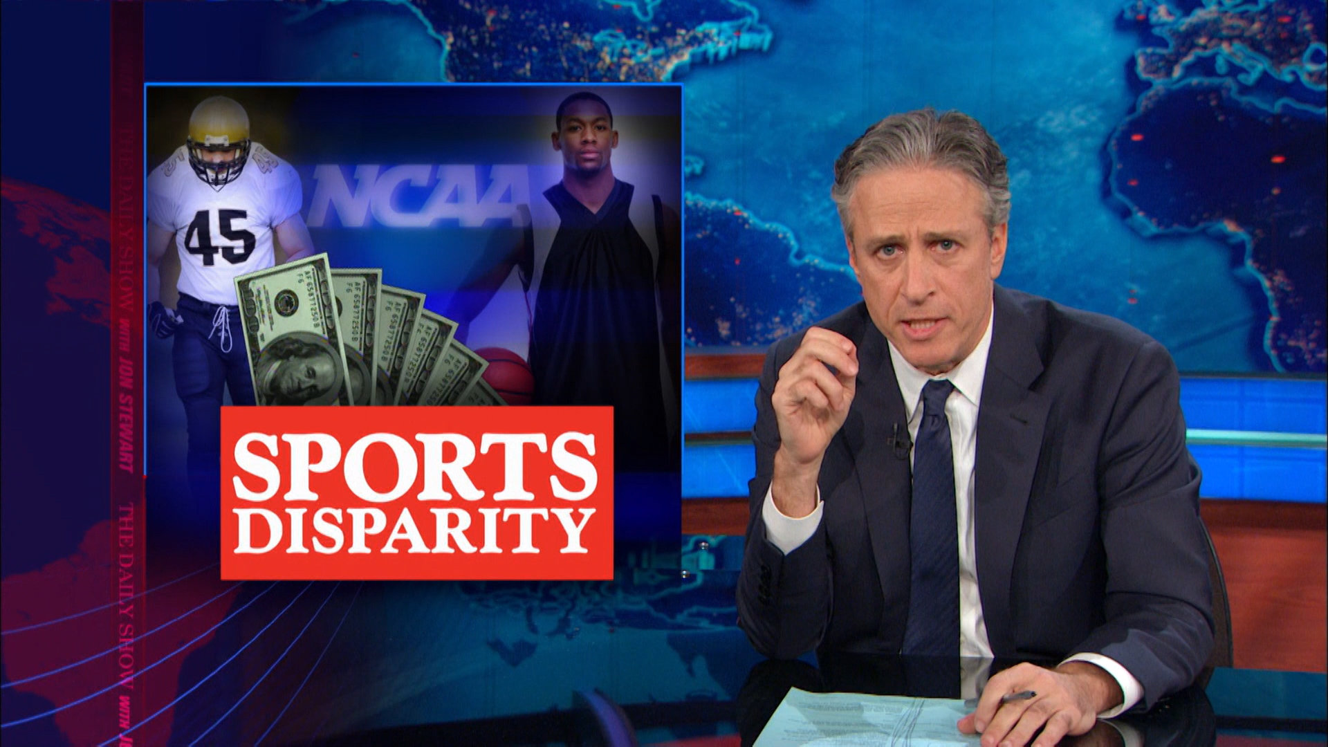 Heimurinn Jon Stewart tekur NCAA fyrir Íþróttafólk í háskólaboltanum í Bandaríkjunum eiga oft ekki fyrir mat á meðan NCAA deildin rakar inn peningunum. Er það sanngjarnt? admin11. apríl 2014