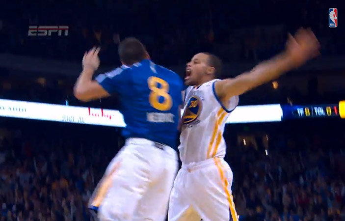 NBA Stephen Curry sendir óvart alley-oop á Andrew Bogut Það er ekki oft sem menn eiga óvart stoðsendingu. admin6. janúar 2014